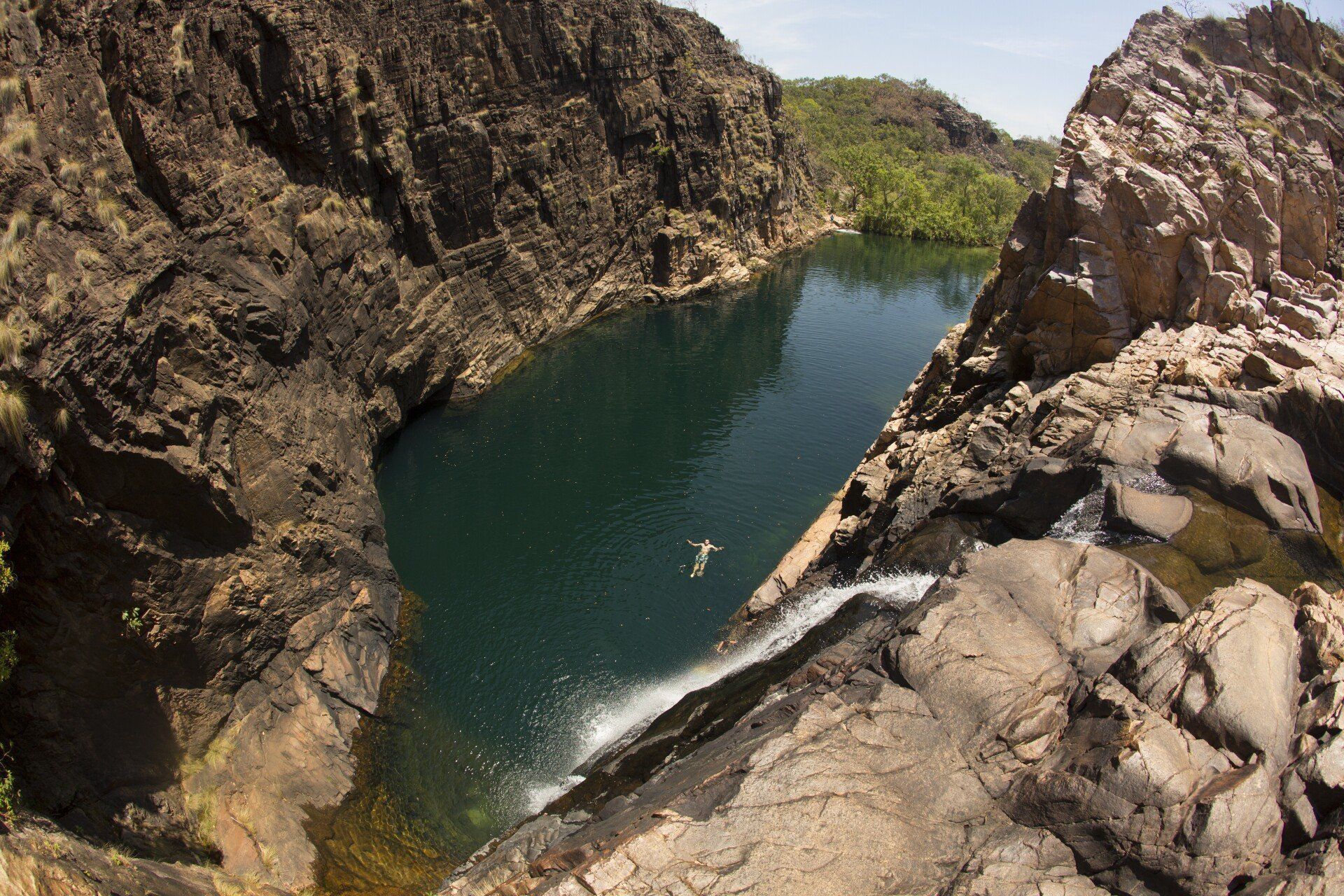Im Nordosten liegt der atemberaubende Nitmiluk NP mit seinen herrlichen Wanderwegen und den zahlreichen Schluchten, auf denen man auch mit dem Boot Touren unternehmen kann. Oder paddelt im Kanu auf eigene Faust los. Zwischendurch anlegen, zu einem der vielen Wasserfälle laufen und baden. Herrlich. Betrachtet Felsmalerien oder unternehmt einen Hubschrauberrundflug über die 13 Schluchten. Für das Aborigine-Volk der Jawoyn, die heute wieder im Besitz des Landes sind und den Nationalpark mit verwalten, hat der Ort eine ganz besondere, historische und spirituelle Bedeutung. In ihrer Sprache bedeutet Nitmiluk „Ort der Zikaden-Traumpfade“.