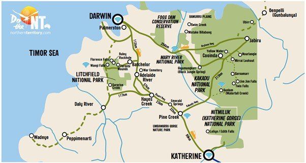 Auf dem Weg liegt der Territory Wildlife Park. Spaziert durch Baumvolieren, um eine natürliche Lagune und geht durch das Aquarium. Macht einen kurzen Stop in Berry Springs Nature Park. Während des Krieges war er ein Erholungscamp für Angehörige der Streitkräfte; heute ist er ein beliebter Ort für ein Picknick und ein Bad in den Süßwasserpools.